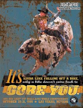 图 8 象一些利用黄金分割原理设计的作品,二的平方根所分割的两个矩形同样具有焦点的作用。在上图这张专业野牛骑手的海报设计的两个空间中,一个放置野牛的图片,而另一个则放置文字,与黄金分割相比,小的区域要略略小于黄金分割的小区域。