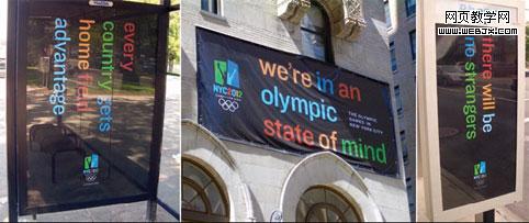 图 10 而有关申奥的户外广告则纯粹由文字组成。字体的颜色采用了五环的颜色,表达了一种纽约市热切盼望能举办奥运会的热情。上图为一些由文字构成的申奥户外广告。