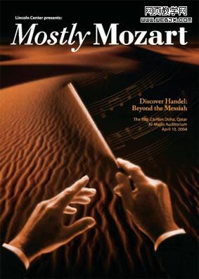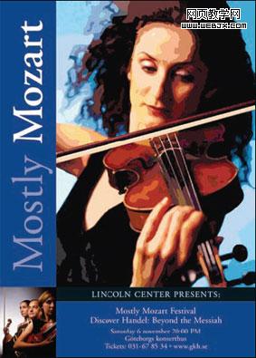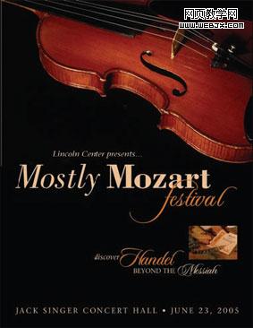 图 15 芬达赫设计的这种海报应用了一张非常大但又简洁的图片,与左下角的这张较多细节的图片及下方较多文字的区域非常协调。同时要留意图中的小提琴是如何引导你的眼睛去到文字上去的。
