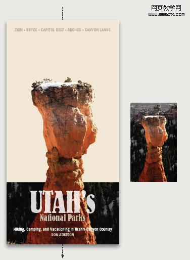 犹他州拥有令人印象深刻的国家公园,但它原来的旅游指南封面设计却没有传达出该国家公园的独特景观,在这个封面中,峡谷、天空及背景都被挤在一个狭窄的版面上,视觉效果模糊。我们要设计的并不是什么包罗万有的全景图,一个好的设计必须有一个焦点,否则这个设计就缺乏力量。看一下我们是怎样改造的。