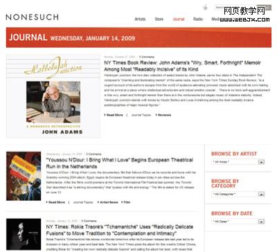 在博客类网站设计中,我们发现一个有趣的现象是很多技巧都是取自于传统(印刷)媒体设计。包括文章的组织,页面的排版,插图甚至于文字的对齐方式都和传统印刷媒体越来越接近。Grid-Based(网格化)设计方式在产品网站,博客以及个人工作室网站得到了广泛的应用,但是在企业站点或者在线商店中还未有出现。