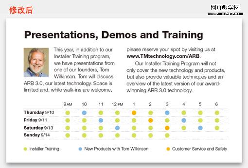 同样的信息,但看起来完全不一样!我们保留了原表格中的颜色,但是由小圆点放在白色背景上构成,显得清新悦目。相关项目不象原表中反反复复地呈现,在这里,我们只在表格下方呈现一次。对于文字,不同的信息由大小不同的文字构成。与旧表格对比,高低立判。而且它只占用原来一半的版面,多出来的宝贵空间,你尽可以放上一些你希望传达的信息。