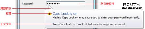 1、例如大写锁定键(Caps Lock)开启状态,密码框的气球状提示(参见图1)。所有者控件处于某种影响输入的状态,该状态可能不是用户所期望的,但用户也许没有意识到其输入所受的影响。当出现特殊情况时(如超过最大输入字符数或大写锁定被启用等),在第一时间使用气球状提示进行警告可以防止用户产生挫败感。它在给出反馈信息的同时,不改变输入焦点,不强迫用户进行操作。这一点非常重要,因为这些特殊情况有可能是故意为之的。这些气球状提示对于密码框尤为重要,因为用户在密码框中输入时只能得到很少的反馈。此类气球状提示带有警告图标。