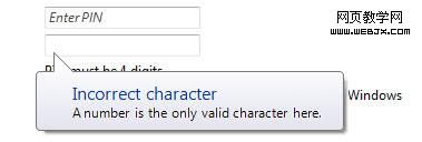 这里用于报告非关键性用户输入错误的气球状提示。使用气球状提示显示错误信息不会改变输入焦点,即使当所有者控件拥有输入焦点时,它仍然非常醒目。 为了解决问题,用户可能需要进行更改或重新输入。但如果所有者控件忽略错误的输入,用户也许可以完全不用修改。由于 问题并非关键,因此不需要使用错误图标。