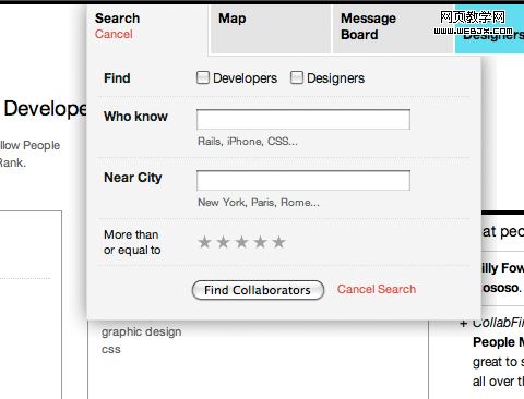 当你点击搜索链接CollabFinder ,你不必进入不同的网页,反而在搜索框中控制下拉,就可以直接开始您的搜索。