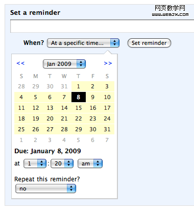 例如,您可以使用下拉列表来选择一个日期的年、月、日,但是与日历选择相比,下拉菜单并不十分有效。在日历选择里,您可以直接点击你想要的一天。 日历选择也能帮助您看到几天、几个星期和几个月内(特别是工作日和周末) ,因此日历选择比一个简单的下拉列表更容易让您作出更明智的决定。