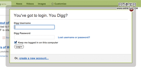 Digg的登录窗口有一个厚厚的阴影围绕它来阻挡网页下方内容的干扰。