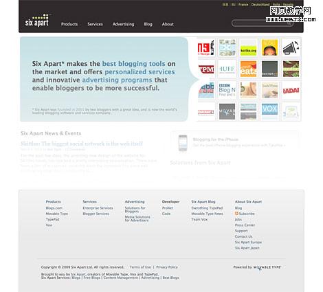 你也可以象Six Apart 一样利用网站地图来连接你的网络站点。在页脚,博客部分,有一些链接到姐妹站点的链接:Typepad,Movable,and Vox.