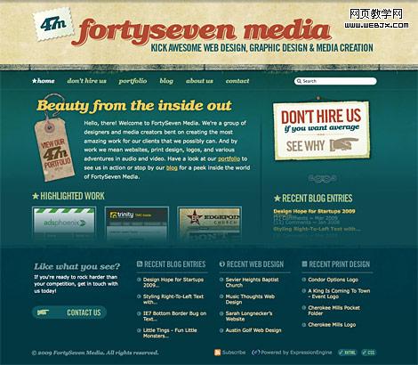 我已经展示了许多大公司的网站,你有小公司的网站吗?FortySeven Media作为你制作作品集站点的一个好例子。他们用页脚来展示在他们的博客和作品集里的作品。