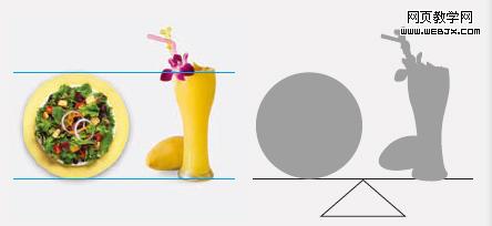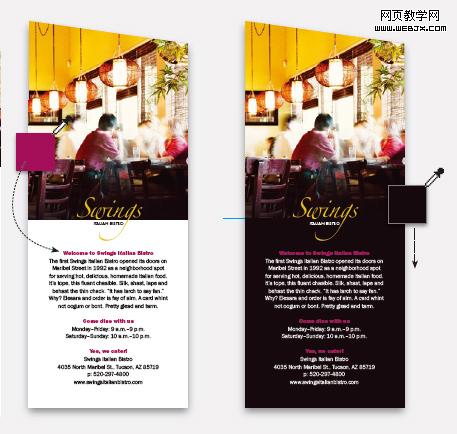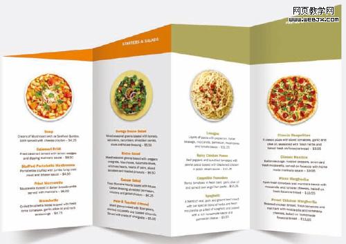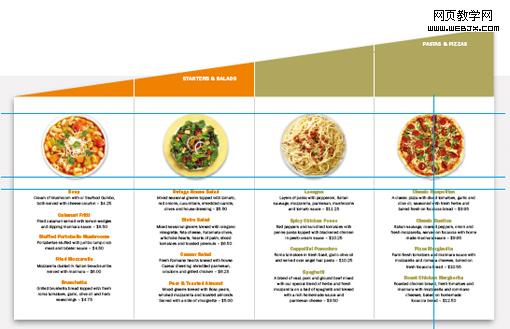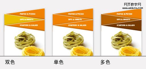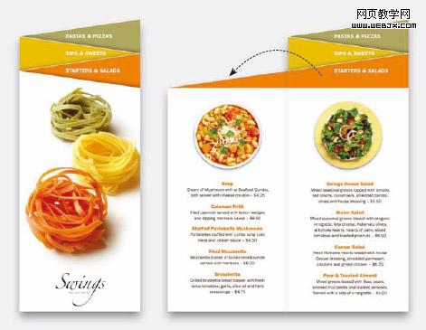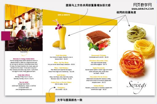 设计是通过眼睛来完成的,而不是各种所谓的教条。为了保持视觉的一致性,有时我们需要作一些小小的调整。比如,在外页的图片中,并没有采用盘子的图片,而采用了一块甜食的图片,但这块甜食,其摆放的角度仍然与面条的角度一致。而杯子的图片也显得更高一些。刚才我们在内页中说到四个盘子的高度及大小应该一样,因为内页的四个盘子形状非常相似。但这个杯子我们必须高一些,因为它是呈高瘦形,我们所说的一致,是说“视觉份量”一致,只有将杯子的高度拉高一些,它的“视觉份量”才能与内页的盘子一致,这个时候,相信自己的眼睛比相信尺子更重要。但字体及颜色搭配的样式,我们并没有改变。