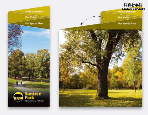 这个锯齿形的单张版式可以有很多灵活的运用,如下方这张宣传邮寄单张就利用占据三个折页的图片来产生漂亮的效果。上方锯齿形区域的区域采用单色搭配,呈现一种低调的层次感。