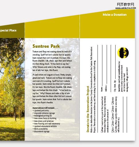 这是一张关于公园的直邮广告,对于邮寄的宣传单张,必须立即能够吸引别人的注意力。上图中,图片承担着最主要的作用,留意说明文字后还有隐约可见的图片。而下方的小图中,是另一种设计风格,与第一种对比可以说是刚好相反,因为这是一种主要以文字而不是图片作为引导的设计(虽然图片仍然为视觉焦点)。留意这两个单张的设计都有一个共同点:即将其中两个折页都作为一个元素来处理。两种设计都OK,设计从来就没有自古华山一条路的说法。