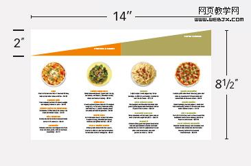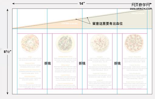 版面具体的一些细节设置,可大致根据上图所示设定即可。上方剪切的角度要适中,要保留有足够的空间来显示标题,但也不要太倾斜。稳妥的办法是设计完后自己打张草图片来折一下看看效果。