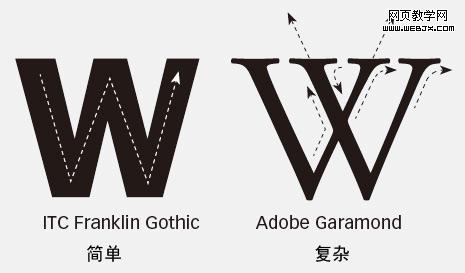 三角形与圆形构成了一种清晰简洁的版式,所以你也需要一种简洁的字体来搭配,我们建议(当然,不是绝对)使用非衬线体,在这个案例中,我们使用Franklin Gothic字体,为什么说这种字体是简洁的呢?我们可以从上面的W找到答案。Franklin Gothic字体的W都是由直线构成,而且线条宽度都相同,没有任何装饰元素。为了对比观察,我们可以看看旁边的Adobe Garamond字体,这种字体无疑是非常漂亮的一种字体,但太复杂,交叉的线条,复杂的衬线,线条宽度也不一样,有很多精心雕凿的细节,衬线与线条之间的弧形转角位,都构成了一种复杂的视觉关系。