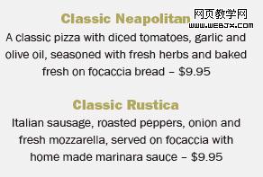 上方所有文字都是采用Franklin Gothic字体,标题使用粗黑体,正文使用正体,标题文字比下方文字要大2个Pt,而两组菜名之间相隔一行。对于菜单来说,价钱象上图加在文字中比单独成一块感觉更好——使人更专注于各种菜肴的特色而不是价钱。