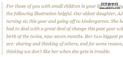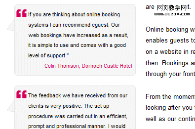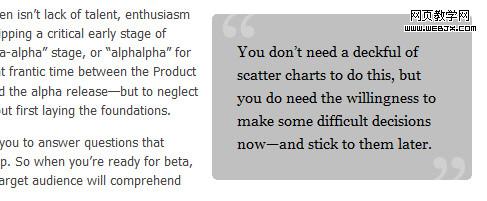 其实我们知道旁引是来自于印刷,它是用来强调一些重要的信息和采访摘录的。格言引用没有被放置在内容里,而是在旁边。这种引用通常比较短且提供一些在文章中不能被找到的附加信息。在网页中,这种技巧似乎用的很少,但是它有其自身的魅力,并且如果使用得当和目的正确,可能能强有力的支持内容。设计者通常使用线或者大遍空白来分离主体内容和邻引述。