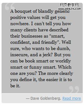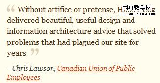 通常引述在文章中没有使用和设计,但是作为一个独立的元素在设计中给一个突出的位置。这种情况经常出现在感谢信里,那里有公司介绍的来自他们客户的格言和关于质量保证的客户确认。在这种情况下格言引用通常是大的、粗体的、清晰可见的。
