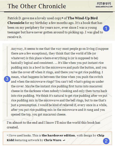 看看这个例子,Naz Hamid在文章中用了一个引用块和一个脚注,脚注的导向链接和脚注本身是相互关联的。访问者可以点击链接跳转到脚注。在脚注里返回图标允许用户跳转回文章原来的参考链接指向处。作者用脚注提供一个个人的在文章中提及的言论(标签1和2).
