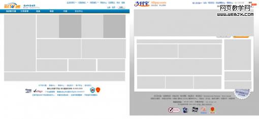 - 支付宝:两个大按钮(轻松体验、免费注册),动态信息区,个人用户,企业用户,流程演示,合作伙,公司动态,新手问题,圆形标签图,两个广告区。