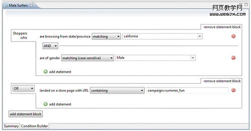 一旦你决定基于哪项数据源来进行用户区分,你需要确认商业环境能基于这些数据点建立定向规则。例如,Elastic Path允许商业用户或市场人员通过一个简单的规则创建器来建立市场区分: