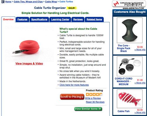 如果你想在某个搜索引擎中找到Cable Organizer,则你可能需要搜索“BEST MATCHES FOR CABLE TURTLE”。如果不喜欢搜索得到的产品详细页面推荐的那一款,你可以立即在旁边看到基于相关关键词的其他相关产品。这就像一个迷你的搜索结果页,在产品页面的右侧: