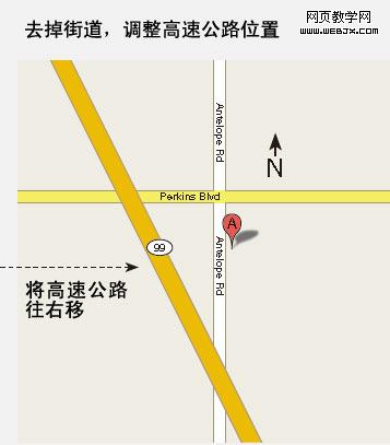 将这条黄色的高速公路往商店方向靠。我们还可以恰当补充一些原来地图中没有的当地建筑物等(如某座商业大厦名称),风格上我们基本可以按照Google地图的特色,背景为灰色,公路是白色。然后进行恰当剪切。