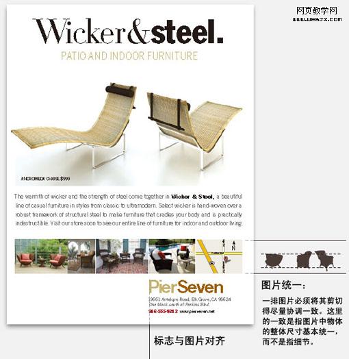 一张大照片及一排小照片可以产生清晰和谐的布局,也使读者更清晰了解你的各种产品。这里的关键是照片尺寸要产生较大的反差。如果大图片与下方的小图片尺寸差异不大,会造成暧昧及混乱的视觉效果(原来的设计就是这样)。留意这时地图已经放到下方照片的最右方,增强这种水平布局的诉求。