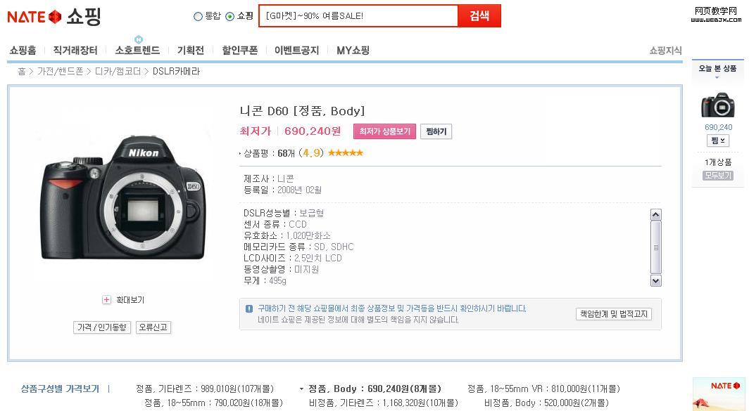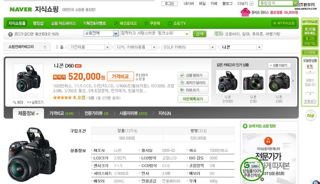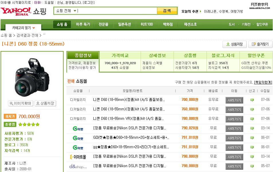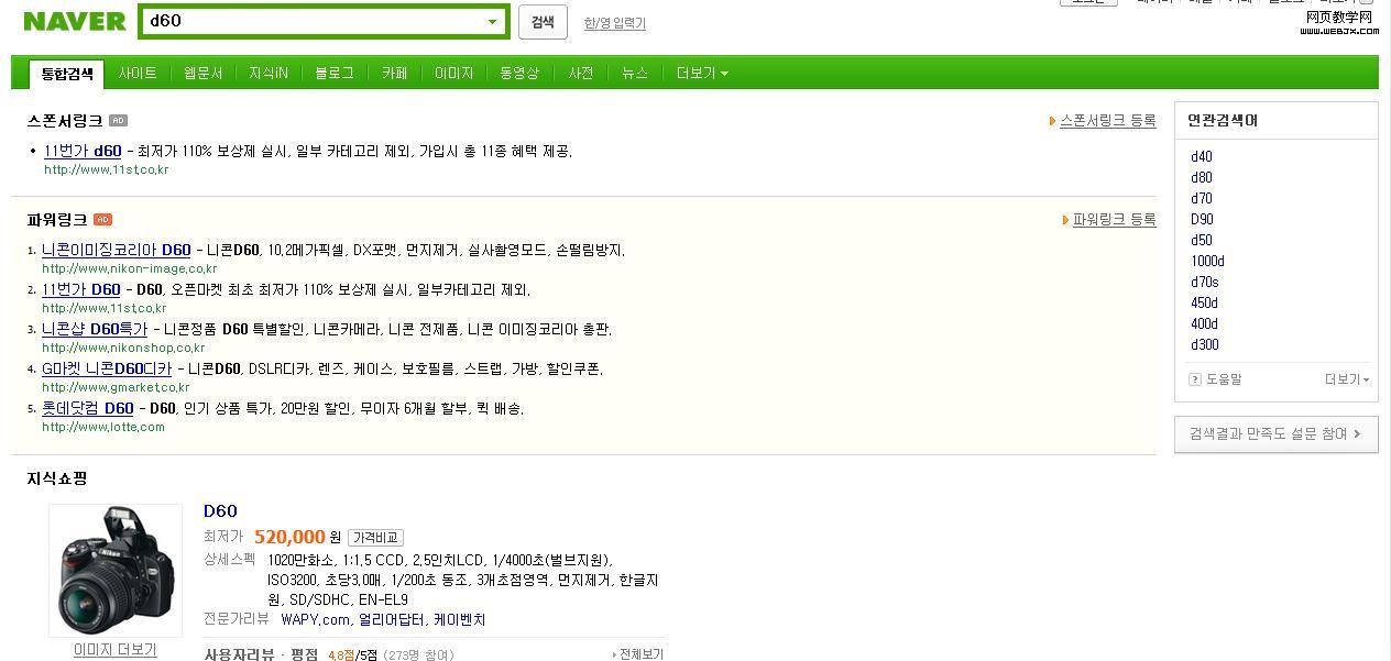 NAVER的搜索结果前6条里有4条是购物网站的:11ST;尼康官方网店;GMARKET和乐天(SEM),下面是D60比价的入口