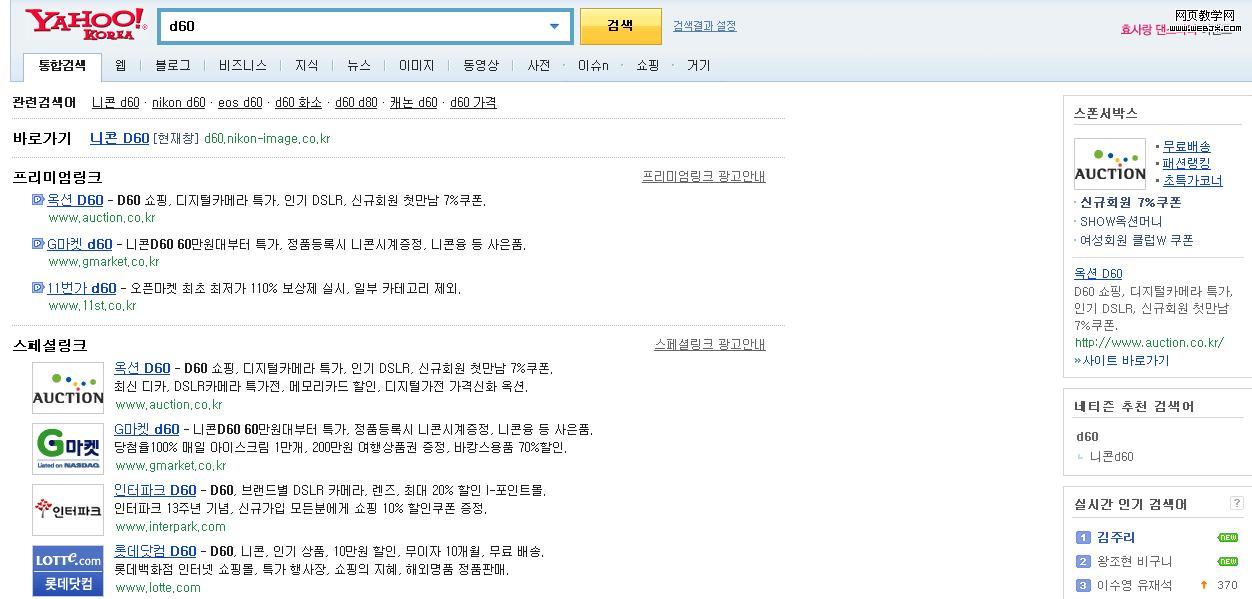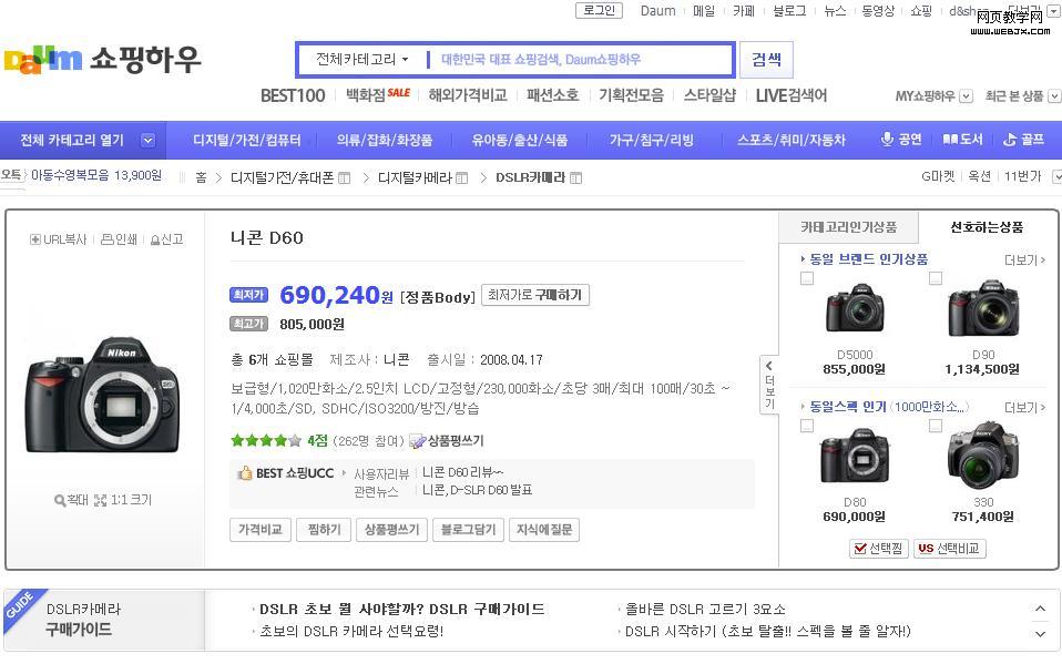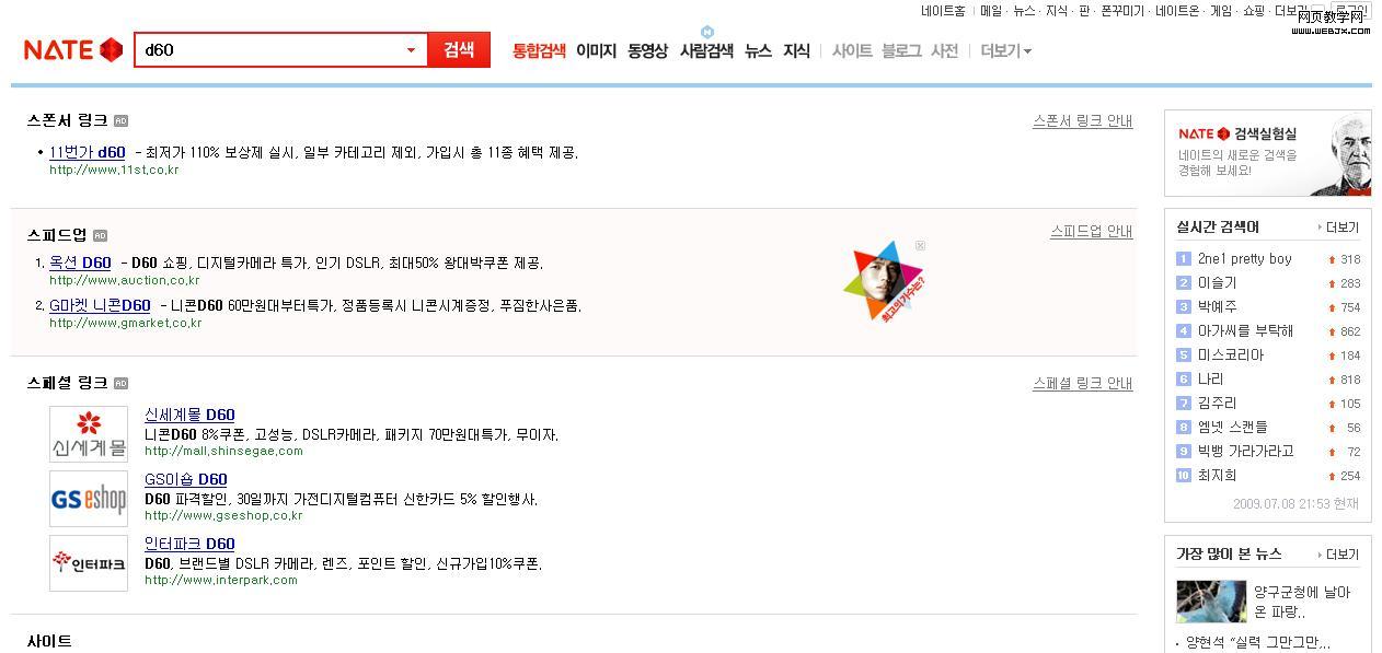 韩国的搜索引擎的搜索结果页面是按新闻/内容/讨论/购物分类的,比如在这几家门户搜索“尼康D60”就会呈现: