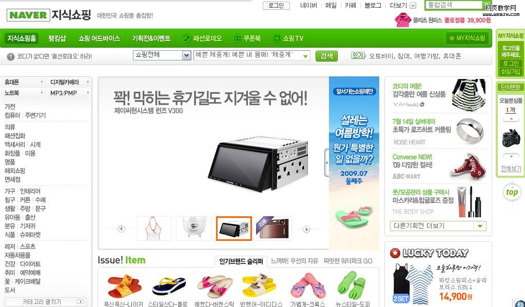 NAVER.com:在首页最好的广告位放置了B2C的产品广告,同时在右下方大版面摆放了商品展示内容。