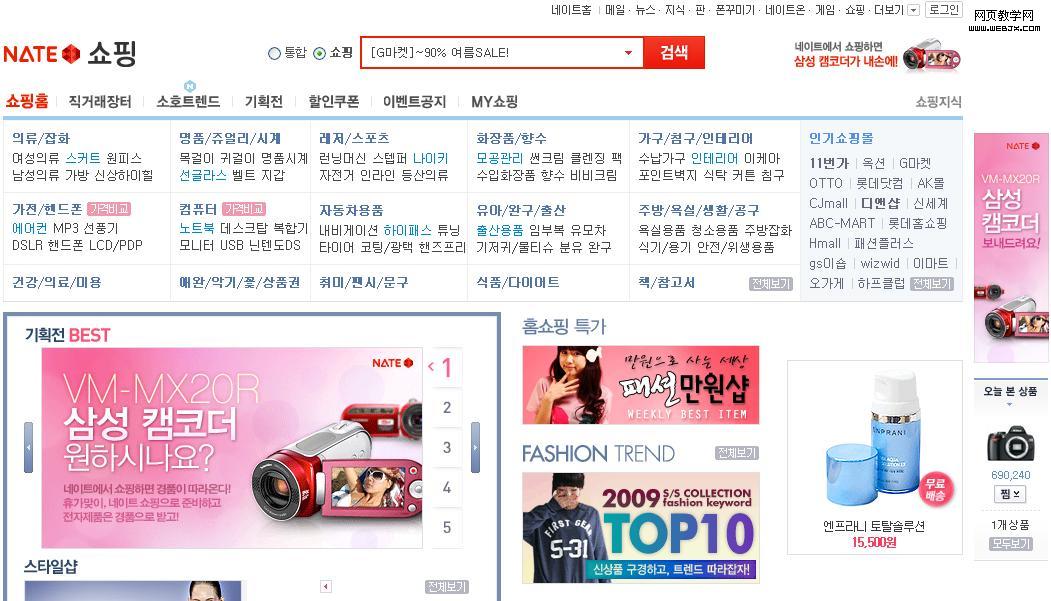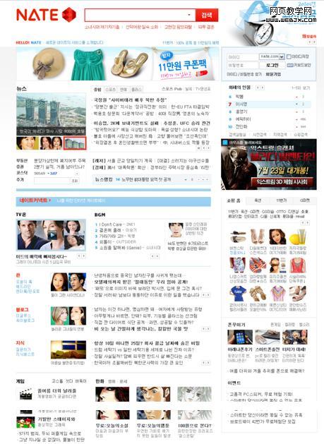 NATE:首页的大BANNER是兄弟网站C2C 11ST的广告,右下方是网购商品展示区,还专门有个11ST专区(CPC)