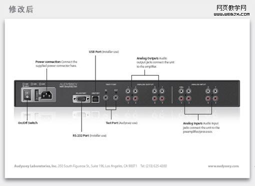 在修改后的版面中,产品显得靠前,而且居中。我们将产品尽可能拉大,然后将各个要说明的部位用引线在其周围说明。非衬线字体容易辩认阅读。文字对比不强烈,整个版面显得干净清爽。并不需要象原图一样采用数字来说明。