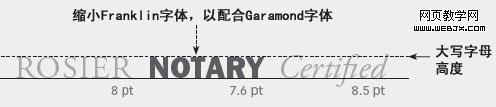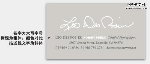 字体调整:我们可以通过对字体进行恰当的调整及选择来加强设计。在这个例子中,经典的 Adobe Garamond 传达了一种久远、传统及权威的感觉,而粗壮的 Franklin Gothic 粗体加强视觉的传达效果。因为上述这些都是差别很大的字体,所以为了使它们在一起能够协调配合,我们需要对个别字体进行调整。在这个例子中,我们将 Franklin 缩小一些。留意在上图名片中,白色的标题放在灰色区域中,显得特立独行。