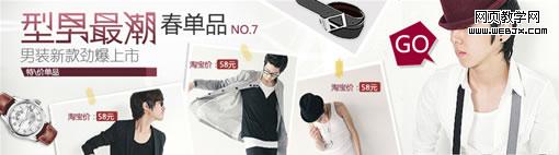 6例是男装的banner设计,大家在设计男装时可以很好的妙用直线条,因为直线条是最好表现男性特征的一个设计元素。在生活中不难看见直线是众多的男性品牌logo设计的根本元素。