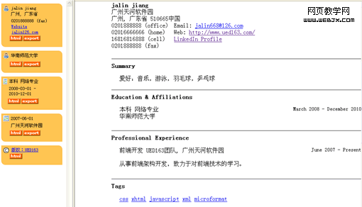 以下是使用Hcard,Hcalendar结合的成hresume的例子: