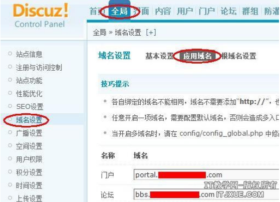 首先以管理员帐号登录论坛后台,然后找到如下路径:【后台】=>【全局】=>【域名设置】,然后再选择【应用域名】 如下图所示(小编把门户二级域名设为了:portal.xxx.com,你也可以直接设为:xxx.com):