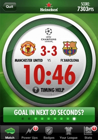 用户通过手机应用程序平台下载喜力啤酒竞猜程序,就可以通过自身手机终端参与欧冠球赛的竞猜。在欧洲冠军联赛进行的时候,当比赛进入点球、射门、角球等等情况的时候,已登陆用户都可以进行猜测然后获得积分。