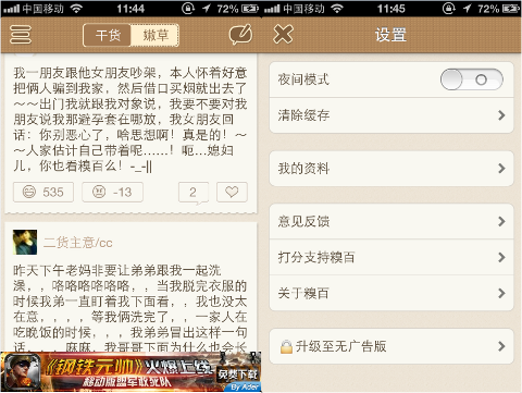 应用内嵌入广告的盈利模式可以说是移动互联网产品使用的最普遍的一种盈利模式了,我们见到的一部分应用和大部分游戏均采用这种盈利模式。应用内嵌入广告的模式操作起来相对简单,只要将广告条放置在应用界面的固定位置(通常是顶部或底部)即可。同时,不同的应用还提供了不同的去广告方式。有通过付费下载去广告版应用来实现向厌烦广告的一部分用户收费的目的,也有较为温和的通过求捐助的方式在博得用户同情的基础上提供去广告服务。糗事百科的 iPhone 客户端就是求捐助去广告方式的一个典型的例子。