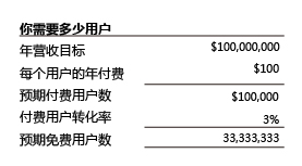 大部分免费增值公司的付费用户转化率都在1%到10%之间(平均是在2%到4%之间),而一个典型付费用户的开销每年也不超过几百美元。所以,假如你想让公司的年营收达到1亿美元,那么这就意味着你需要获取上千万的用户(看下面的这个图表)。假如你的市场没有那么大,那么你在一开始就不应该套用免费增值模式了。