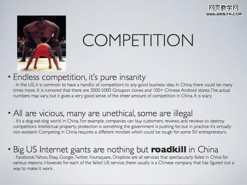 我最近在Slide Share上看到了一篇题为“中国创业企业报告” 的文章,作者叫Bowei Gai,是一个在中国出生,后来又移居美国的创业者。我觉得它很有意思,因为它指出了外国创业者,在随着这波“淘金热”来到中国创业时,所要面临的严酷现实。里面很多地方都让我想起了我在这里学到的东西。我总是喜欢这样描述中国,“有趣,令人兴奋,但并不容易”。