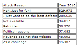 根据Zone-H的数据,2010年有150万网站遭受剥面攻击,被黑的屏幕截图如下图所示显示了攻击的原因: