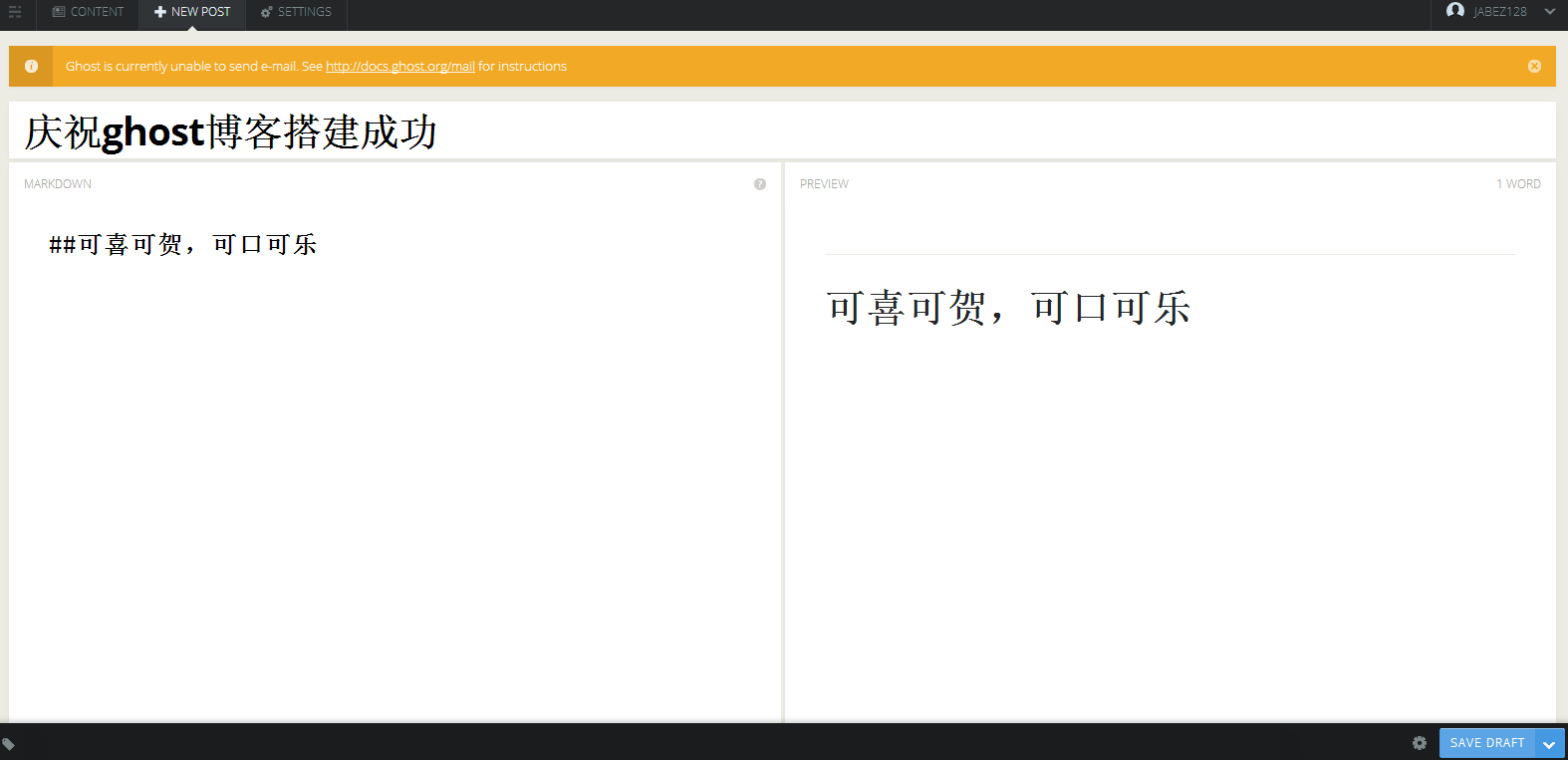 现在可以开始写博文了,点击上方导航栏中的New Post,开始写第一篇博客: