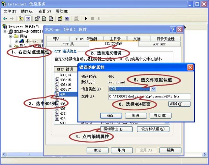 打开IIS管理器-->点击要设置自定义404的网站的属性-->点击自定义错误选项-->选中404页-->选中并打开编辑属性-->设置成文件或默认值-->URL 里填写“/404.html”,按确定退出。再把做好的404.html页面上传到网站根目录下。此处在“消息类型”中一定要选择“文件”或“默认值”,而不要选择“URL”,不然,将导致返回“200”状态码。