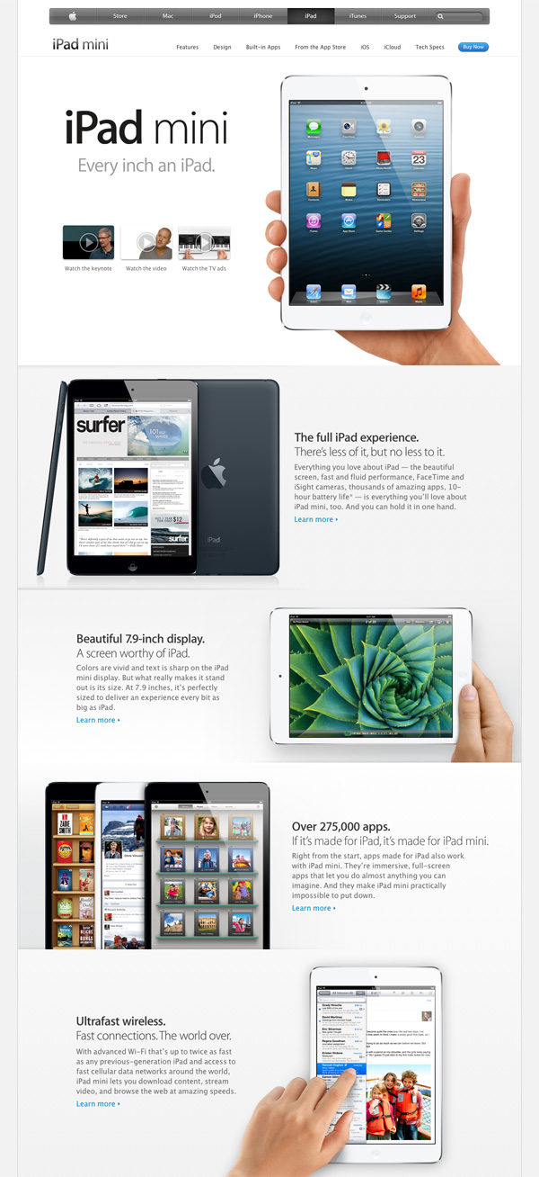 Apple公司也采用了分割式布局。这里是iPad mini的页面,看看它是多么轻易地将每个展示iPad mini不同特征的图片联系起来的。感觉不错吧!