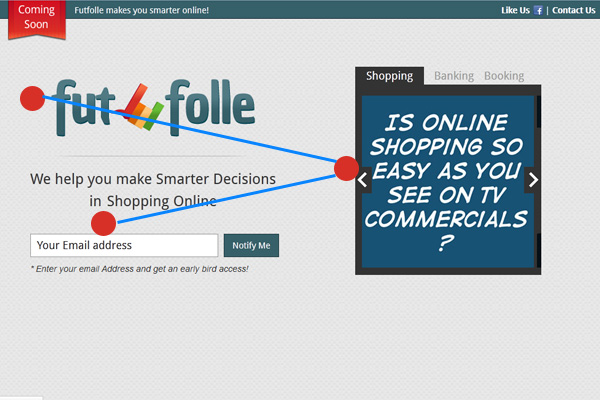 你能看到两等分如何体现出一种良好的视觉层次。首先,顶部的“即将来临”的红色缎带很引人注目。其次,标志也很鲜明。现在,跟随我之前提到的“之”字形,访问者看到右半部分的图片滑块,最后,到达电子邮件提交表格。