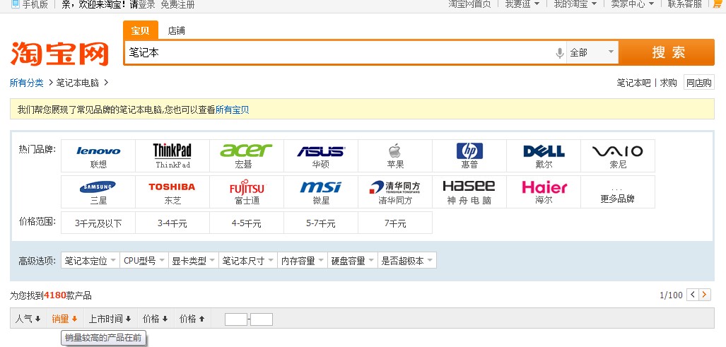 我们可以看到在搜索结果中,除了笔记本的相关信息外,还多了一个条件搜索框,在条件搜索框中我们可以根据我们品牌、价格、定位、配置等条件来将搜索结果的范围搜小,获得更加准确且符合我们胃口的搜索结果。例如我们可以获得:联想3~4千元的学生笔记本。访客在我们的平台上做站内搜索时可能对于自己想要的信息并不是很明确,对于我们的站点来说如果可以通过合理的指引来帮助访客获得他们想要的内容信息的话将可以很好的改善用户体验。诸如淘宝网这一类大型的电商平台来说,同一类产品的不同种类都有可能长千上万,在访客搜索意图并不明确的时候,他们的目标可能随时都在变化,这就需要我们从搜索结果中提供给访客不同的条件选择,从而让访客可以更加明确的找到自己想要的内容。