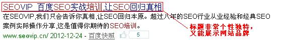 要怎么样才能设置好一个既不会大众化,又能突出品牌的网站标题呢?笔者认为要做到以下几点:第一,不要再用关键词写标题了。这个是seoer做网站的通病,他们往往认为一个网站关键词要获得排名就要多次在网站标题出现,其实这是错误的做法。关键词可以自然出现在标题上面,但是不要把关键词当成一个标题了,这样做只会让你的网站变得毫无特色。第二:标题要一针见血。人们生活节奏是很快的,用户都是带着他的需求来寻找网站,所以他们目的性很强,如果你的网站标题不能一针见血地把目的性描述出来,用户很容易就会忽略你的网站。第三:标题要讲求新颖独特、突出品牌。我们可以用robin的seovip的标题来做个例子: