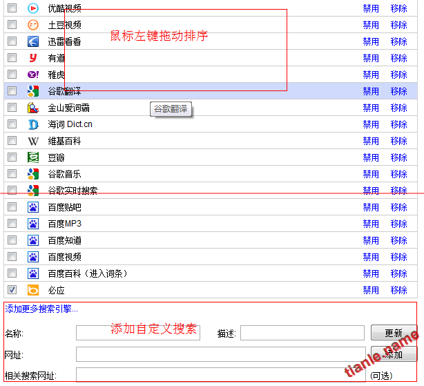 添加、删除、修改、排序、自定义搜索引擎,如下图: