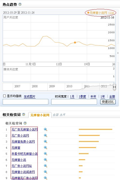 这2个截图当中,你会点击哪一个结果呢?了解到我们的用户需求是无弹窗的,所以如果在网站搜索结果页面注明我们的网站是无弹窗是不是就会增加用户的 点击?而很多小说站并没有在标题里注明无弹窗(即使真的是无弹窗),大家可以看下图这个网站的标题基本都带有“无弹窗”的字 眼,这个就是用户体验的差异化,吸引用户的点击。