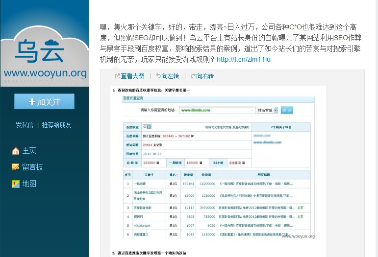 国内知名安全问题反馈平台WooYun(下文简称乌云)昨日曝光了一家黑帽电影网站的作弊细节。据乌云平台估算,该网站通过垃圾站+挂黑链方式,进行黑帽seo,从而提高百度排名,可实现日收入过万。